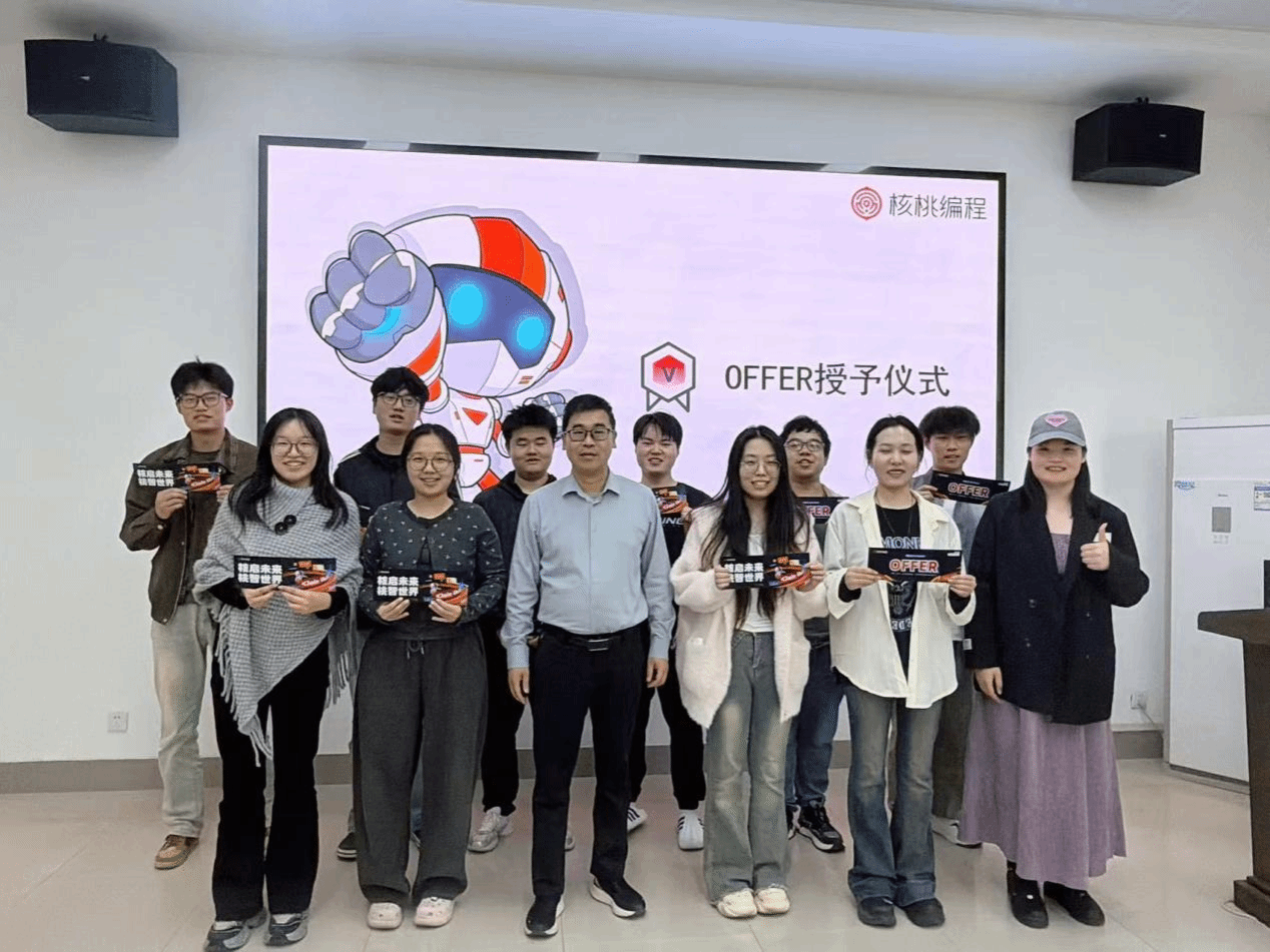 结营仪式上,杜鹏向圆满结业的学员表示祝贺,向核桃编程的支持与付出致谢,并对学员提出三点期望:一是坚守专业初心,深耕技术领域,将培训所学与专业学习深度融合,夯实基础、提升素养,成长为人工智能领域高素质人才;二是强化实践锤炼,主动把理论转化为能力,勇于创新探索,成为兼具理论功底与实战能力的复合型人才;三是常怀感恩之心,砥砺奋进前行,以扎实工作与优异成绩回馈学校、企业与社会。