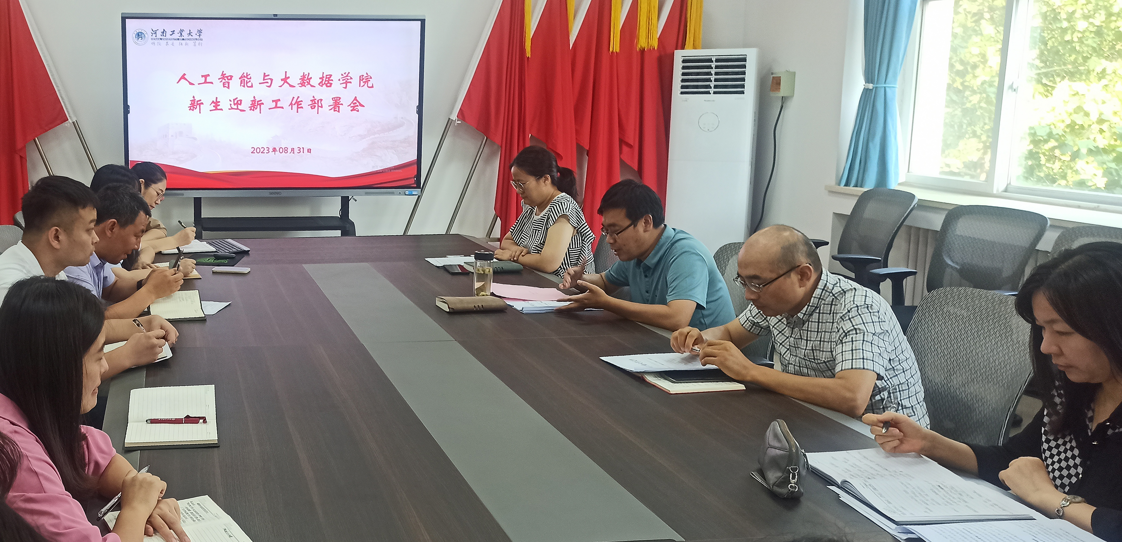 于2023年8月31日在学院6371会议室召开了迎新工作部署会。会议由学院党委书记杜鹏主持,学院领导班子成员、各科室负责人、系主任及科大讯飞企业教师负责人参加会议。