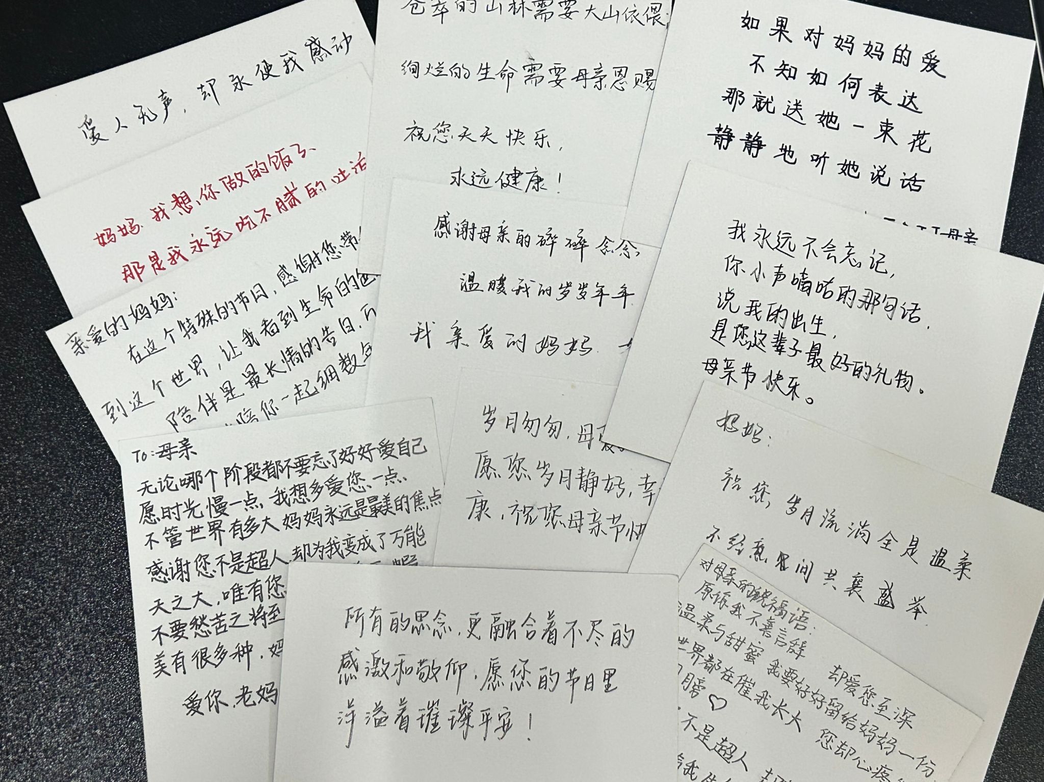 于5月7日举办了绘制心愿卡活动。同学们怀着感恩的心情在学院准备的精美心愿卡上写满对妈妈的祝福。“妈妈,您辛苦了”、“您陪我长大、我陪您变老”、“妈妈,愿您永远健康幸福”,一句句感人至深的话不禁让人潸然泪下。同学们借助一张张小小的心愿卡,向母亲表达了心底想说的话语,用美好的祝福传递自己的反哺之情。
