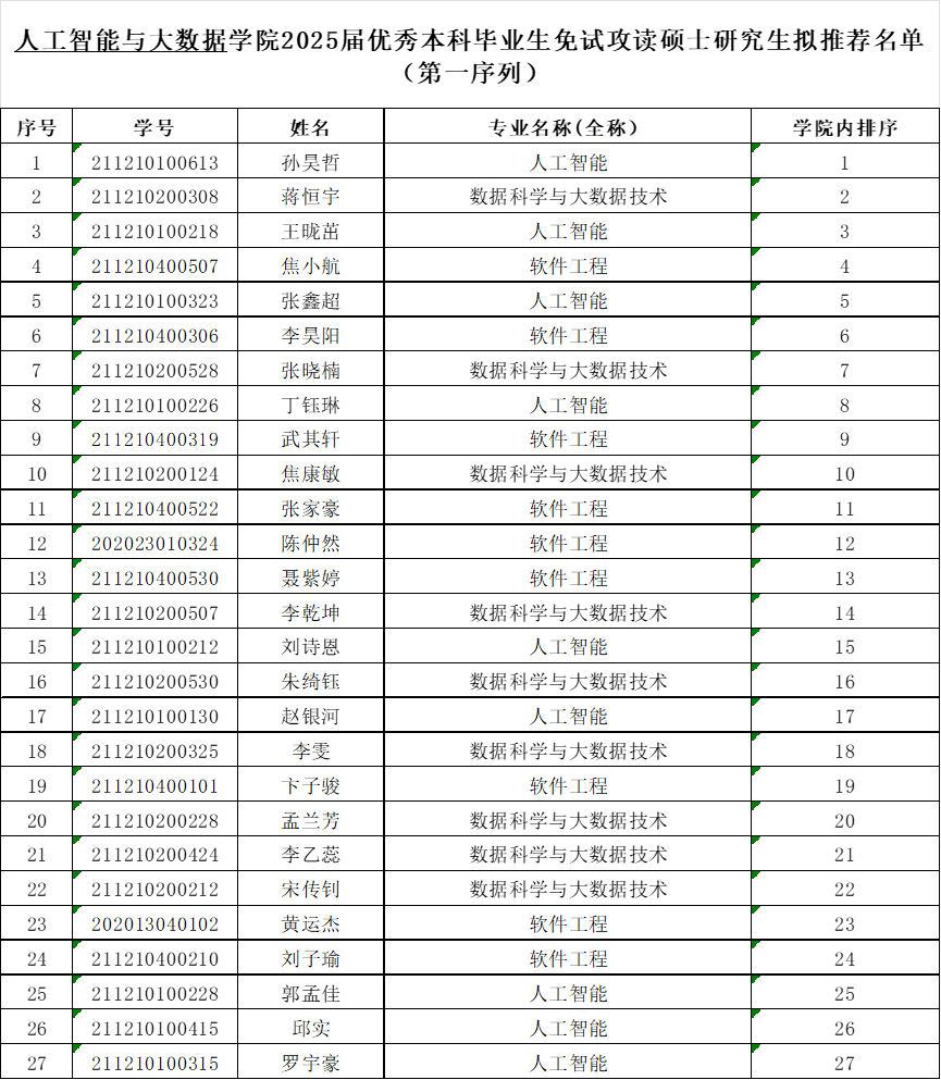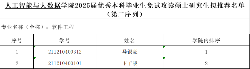 推荐优秀本科毕业生免试攻读硕士学位研究生工作执行方案》有关规定,经学院推免工作领导小组研究审核,确定软件工程、人工智能、数据科学与大数据技术3个专业拟推荐名单如下,现予以公示。