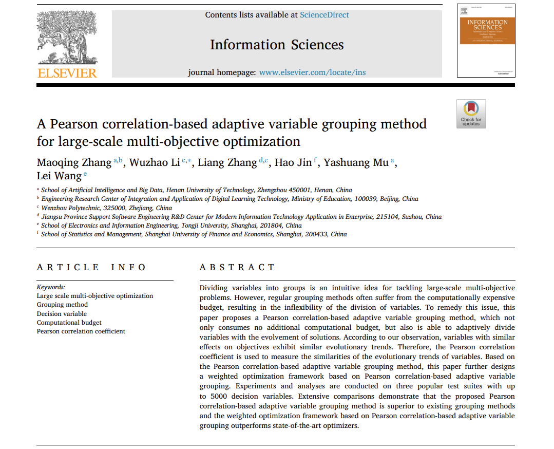 近日,我院复杂图像处理与理解团队成员张茂清博士在国际高水平学术期刊Information Sciences(中科院一区Top, IF=8.1)上发表了题为“A Pearson correlation-based adaptive variable grouping method for large-scale multi-objective optimization”(DOI: 10.1016/j.ins.2023.02.055)的研究论文,该成果是解决大规模多目标优化问题的阶段性成果,快猫短视频