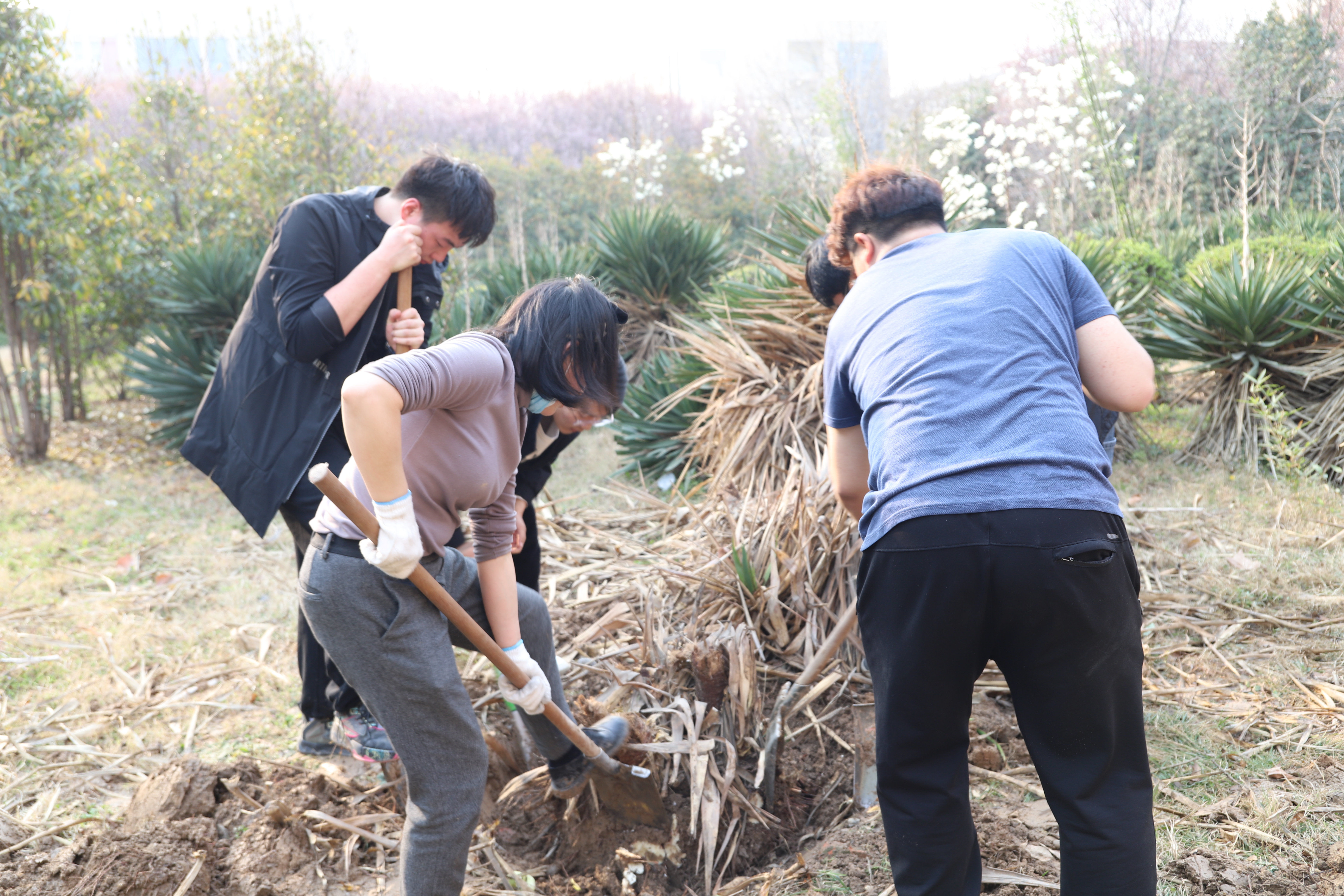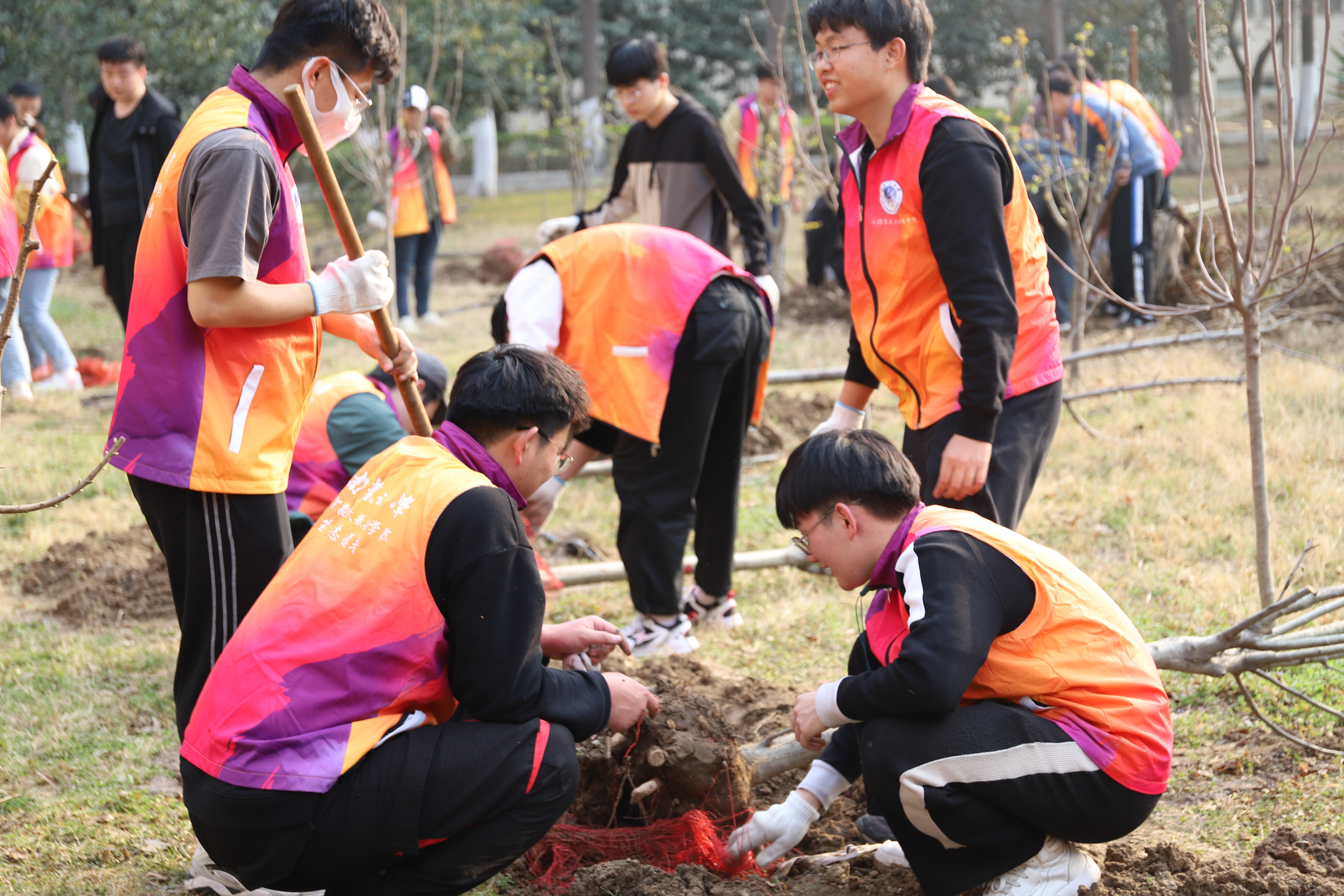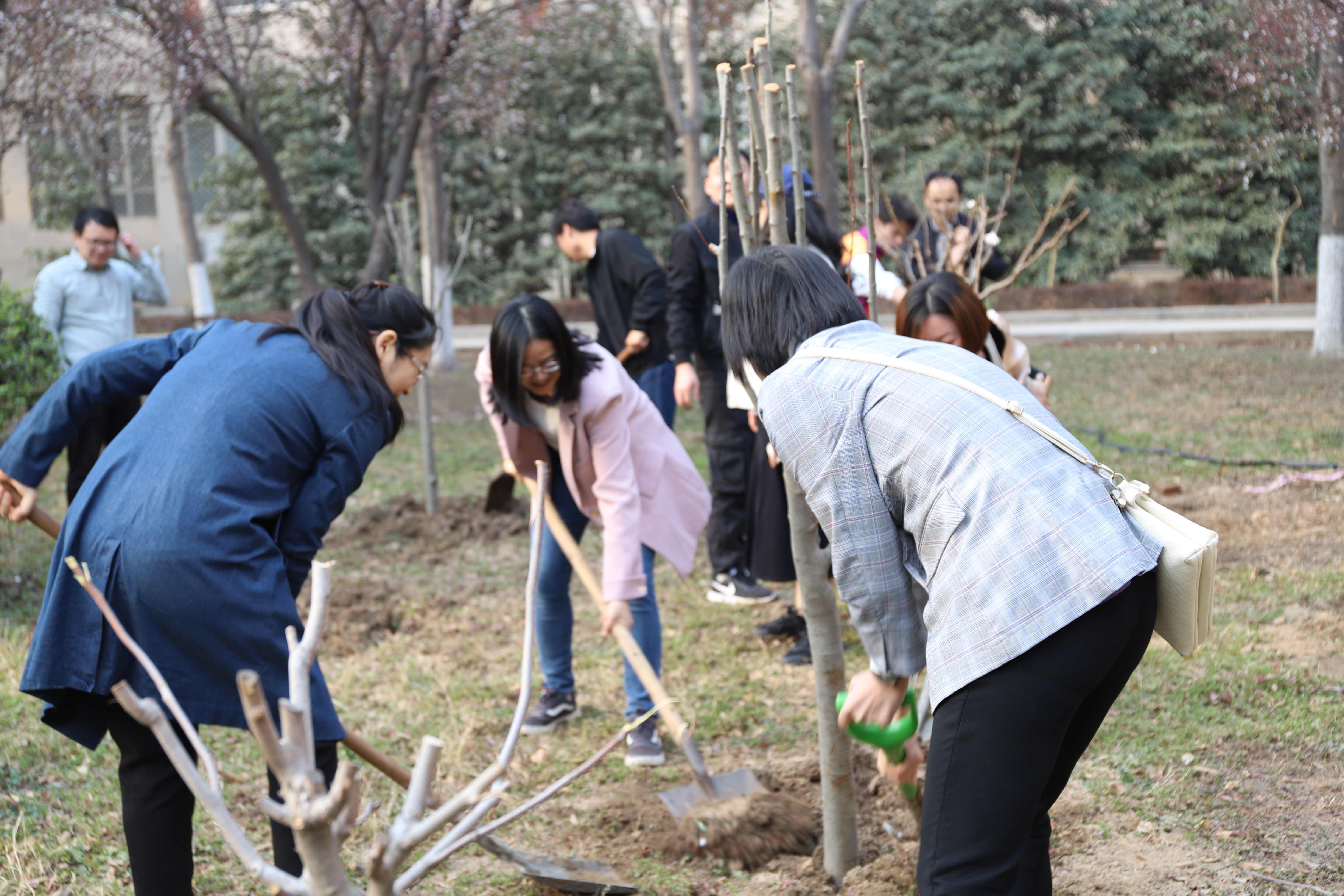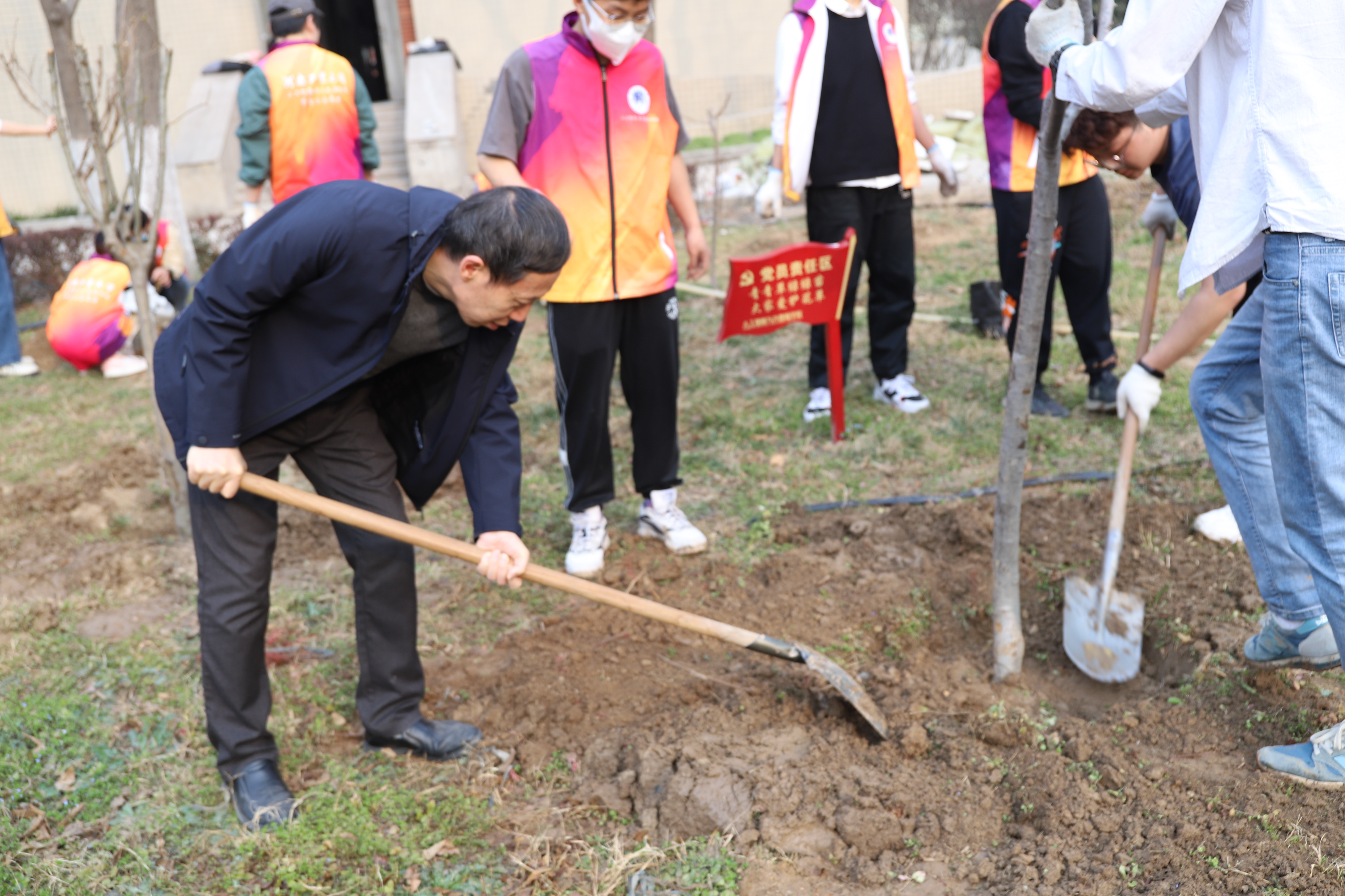 在学院党委书记付晓炎、学生第一党支部书记杨龙的带领下,师生党员们在逐个检测体温,对劳动工具一一进行消毒后,迅速行动起来,以饱满的热情投入栽种的行动中。师生党员们三、五人一组手拿工具,挽起衣袖,干劲十足。挥锹挖坑、扛树扶苗、栽种填土、踩实浇水,每道工序都一丝不苟,各个环节配合默契,确保栽植一片、成活一片、美化一片。经过一个多小时的努力,突尼斯石榴、垂丝海棠、核桃树等多个品种的40株果树在“迅飞林”内“安家落户”,为初春的工大校园增添了一抹生机和活力。