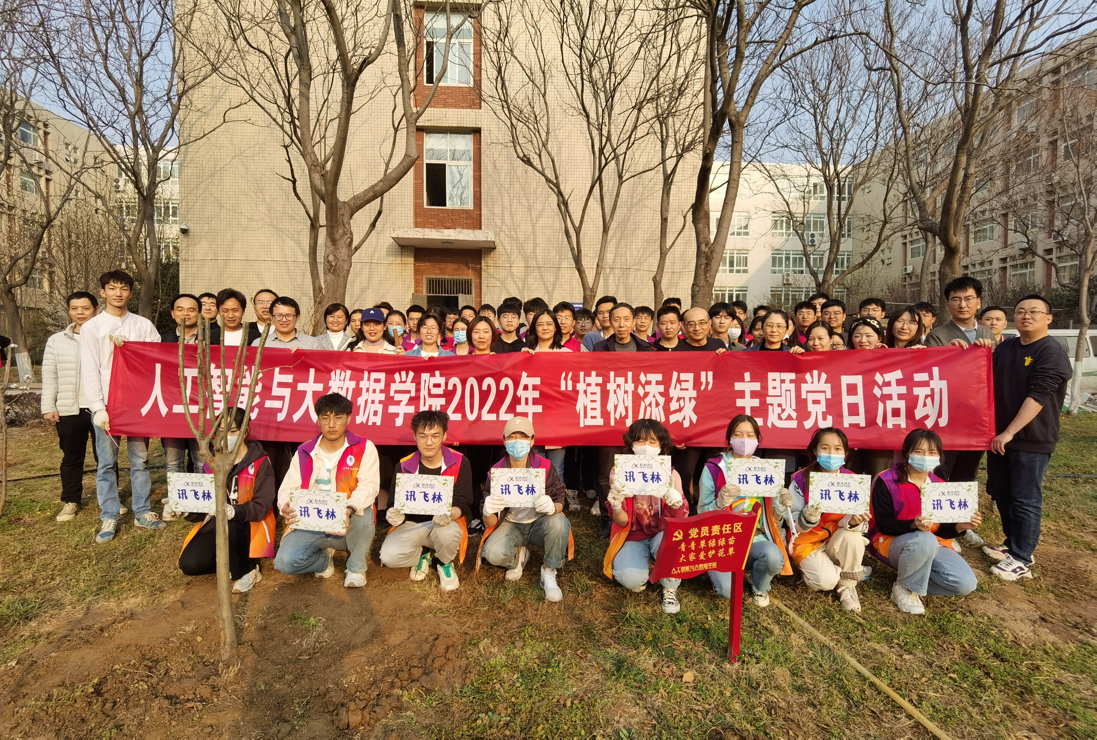 党委组织全体师生党员在校内开展了“植树添绿”主题党日活动,通过栽种树木,支部认种领养等方式,为六号楼后的“讯飞林”再添新绿,以身体力行的方式巩固学校多年来的植树绿化成果。