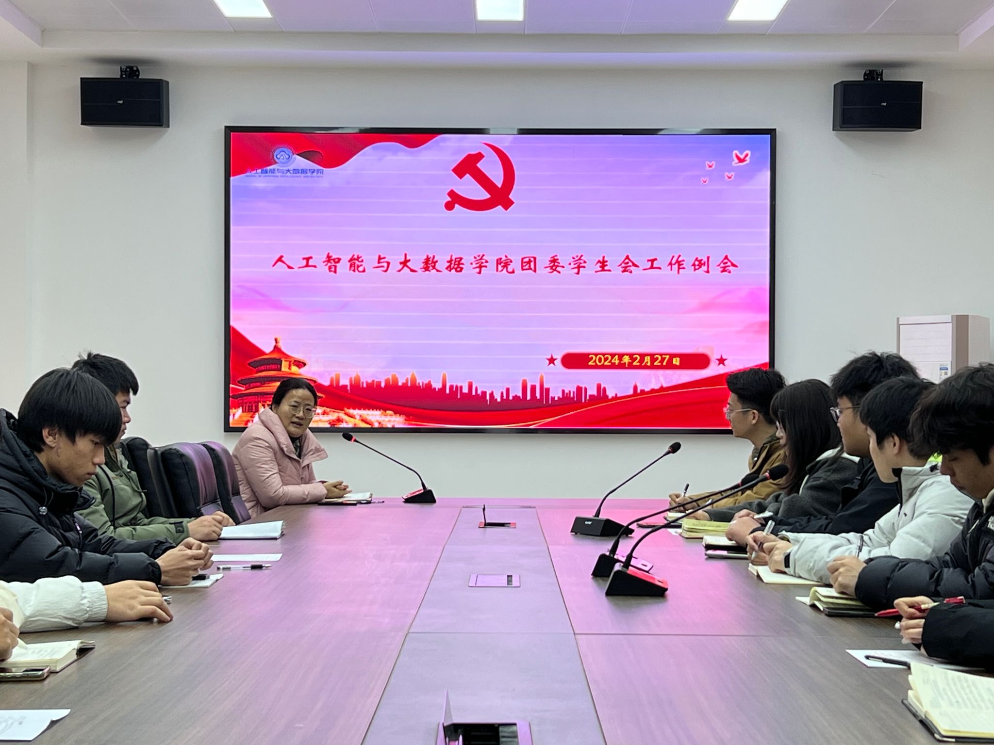 在6369会议室组织召开新学期院团委学生会第一次例会。学院党委副书记薛运侠、团委副书记郑帅、辅导员王翔宇及团委学生会全体骨干成员参会。