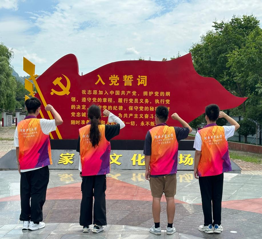 在何家冲文化广场,团队成员们面向鲜红的党旗,高举右拳,许下了铿锵有力的誓言:“传承红色基因,赓续革命精神,不负青春韶华,不负时代重托!”他们的声音回荡在整个广场上,是对历史的回响,也是对未来的承诺。
