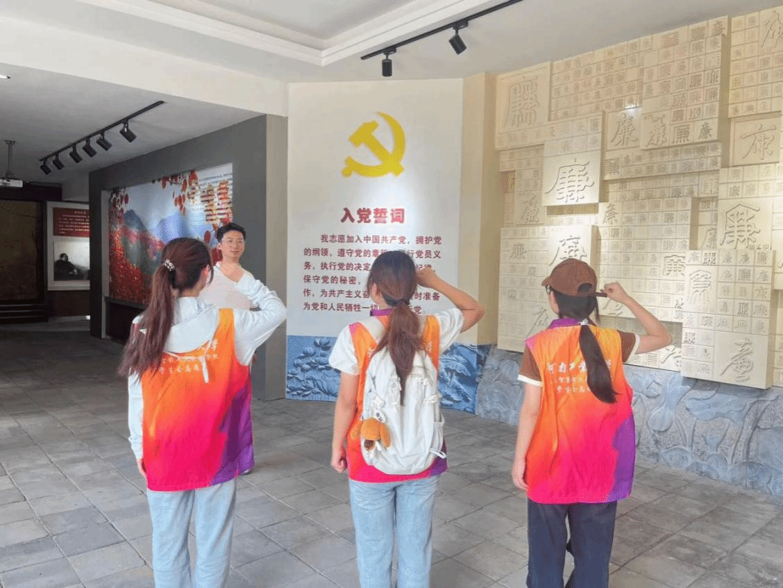第一站,实践团队满怀对历史的敬畏,步入了这片浸透着革命鲜血的土地—何家冲。这里,是红二十五军长征的壮丽起点,每一粒尘埃都仿佛诉说着那段可歌可泣的峥嵘岁月。在何家冲文化广场,团队成员们面向鲜红的党旗,高举右拳,许下了铿锵有力的誓言:“传承红色基因,赓续革命精神,不负青春韶华,不负时代重托!”他们的声音回荡在整个广场上,是对历史的回响,也是对未来的承诺。