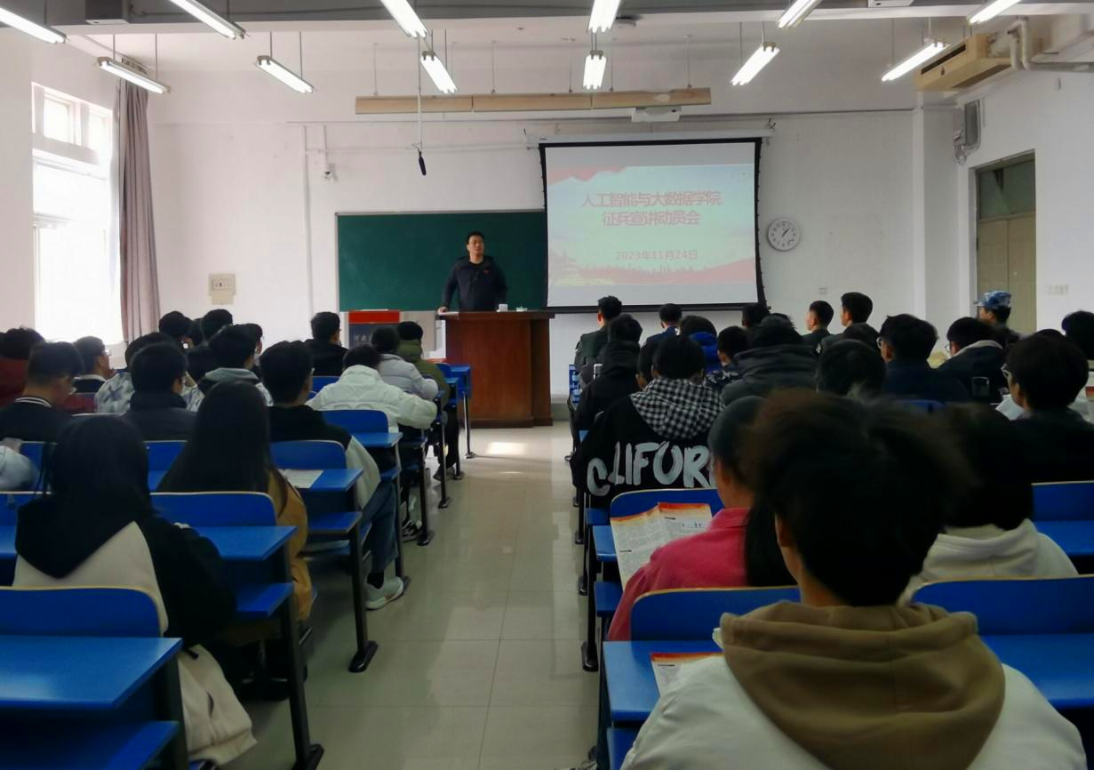 会议伊始,潘都向同学们分发征兵入伍宣传手册,播放征兵宣传片《火热军营,精彩人生》。为同学们作了详细的征兵政策解读,从大学生入伍优待政策、义务兵役待遇、征兵入伍流程等方面;大学生参军入伍的资助政策方面,介绍了学费补偿、国家助学贷款补偿以及学费减免等优惠政策及申请流程。他鼓励学生积极响应国家号召,投身军营,在军营中绽放青春之花,收获精彩人生。