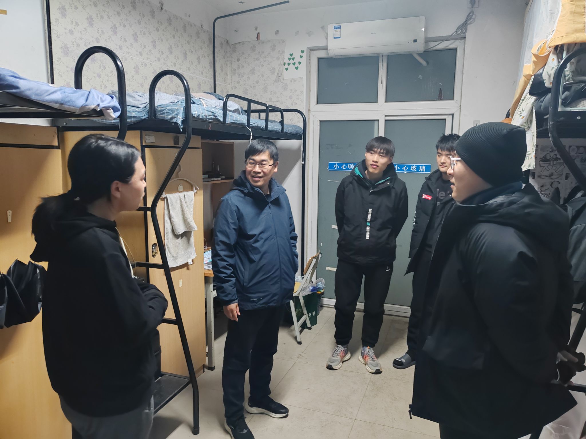走访中,杜鹏亲切询问了同学们的假期生活以及返校交通方式,鼓励同学们在新学期力争上游,继续追逐远大理想,争做有责任有担当的新时代大学生。樊超提醒同学们要快速调整新学期状态,投身到学习中去,在学业中有困难的地方要积极和任课老师以及班主任、辅导员沟通交流。薛运侠对同学们返校表达了热情的欢迎,反复叮嘱同学们要增强安全防范意识,保持通风,加强疾病预防,合理安排时间,认真学习,积极参加实践活动,营造积极健康的宿舍文化氛围,加强身体锻炼,为今后的学习和工作打下坚实的基础。赵玉娟勉励同学们要坚定信心,努力学习,多阅读、善思考,在专业功课上多下功夫,通过自我约束、自我管理,争做品学兼优之人。